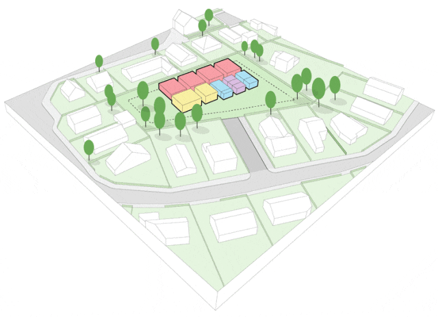 整个建建包罗四个结构不异的班级教室、一个多功能厅、一个餐厅、一些储藏设备、一个厨房和一个员工歇息室。为了让它们结构合理、美妙,建建师选择了将教室两两归并,环绕着地方的多功能厅背靠背安插。