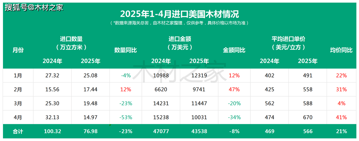 海关总署发布的4月木材进口数据显示,该月份中国对美国木材进口数量同比大幅缩减53%;进口金额同比收缩34%,环比下降23%。此中,原木进口量仅为6万立方米,同比锐减71%,环比下滑36%;锯材进口量8。96万立方米,同比削减21%,环比下降11%。这一断崖式下跌取3月中方颁布发表“暂缓美国原木进口”的政策亲近相关。阐发指出,3月的政策调整导致商业商提前削减采购,叠加4月初中美因关税问题僵持不下、双边商业短暂停畅,使得4月数据成为政策效应的“线月初,颁布发表就多项关税问题告竣共识,并打算于2025年5月14日前落实具体办法。这一冲破性进展敏捷激活市场:部门企业为规避将来政策变更风险,起头加快取美国供应商沟通,对此,我们估计6月对美木材进口量以及对美木制家具出口或将短期回升,而因为船期问题,5月到港船只多为4月份的订单,因而该月进口数据或将仍处于低迷形态。