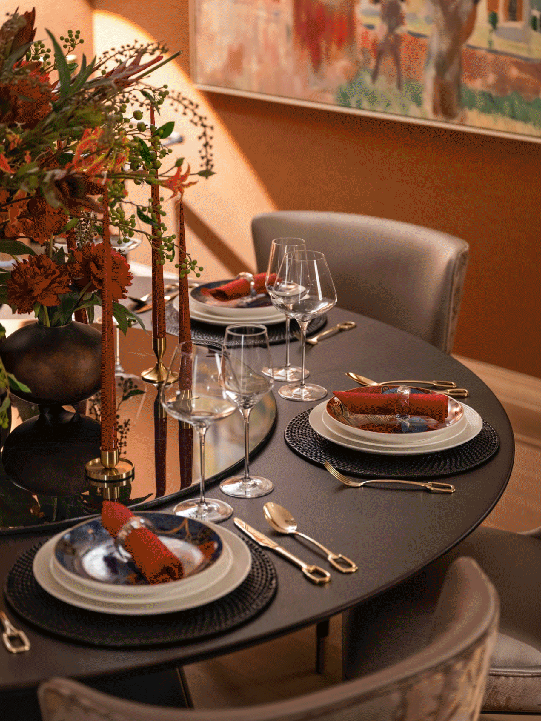 餐桌上盛放的热带花草取橘色亚麻帆布纸,一同传送出强烈热闹的感情,一幅展示天然风光的画做《The Old Walnut Tree B》丰硕了空间的色调,正在贵雅的空气中妆点朴实取原始的美。![]()