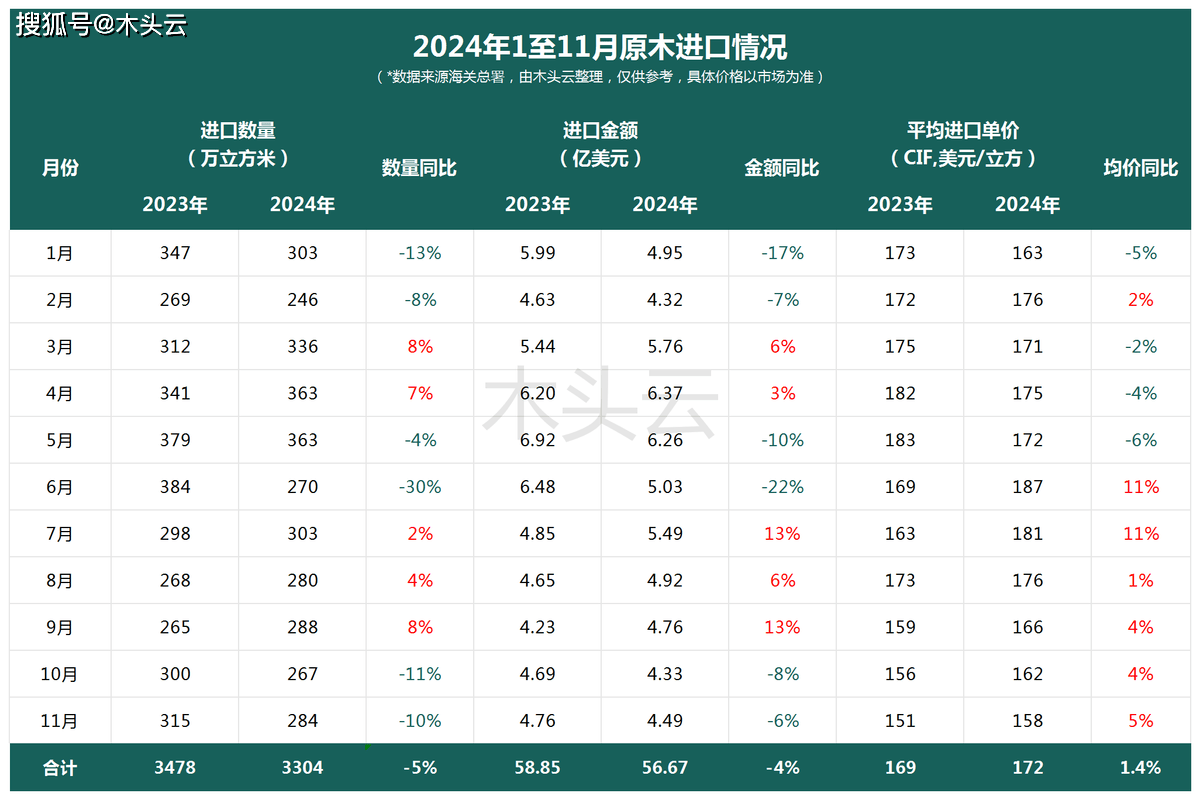 从细分市场来看,2024年11月,全国累计进口原木284万立方米,同比下降10%,进口金额同比下降6%,达到4。49亿美元。11月原木平均进口单价增加5%。取此同时,锯材进口也同步呈现量贬价涨趋向。2024年11月全国累计进口锯材184万立方米,同比大幅下降19%;进口金额同比下井13%,达到4。66亿美元。11月锯材平均进口单价增加5%。