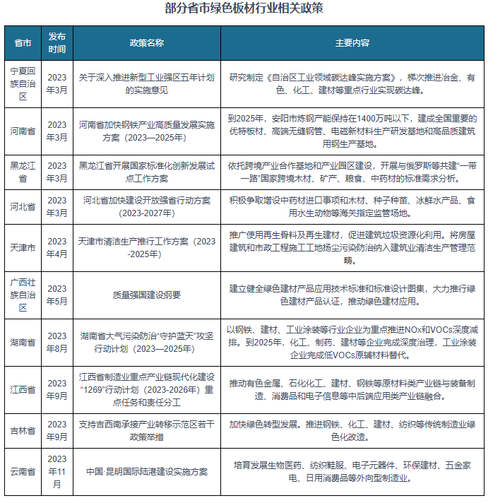 绿色板材又称绿居材,是指以木材或非木质动物纤维为次要原料,加工成各类材料单位,(或不)胶粘剂和其他添加剂,其出产、利用及烧毁过程均应合适国度相关环保和健康尺度要求的人制板材。充实阐扬丛林多种功能,近年来,为了推进绿色板材行业的成长,我国连续发布了很多政策,如2023年地方、木材、竹材、丛林药材等主要初级林产物供给能力扶植,激励林业大省、大市、大县培育林业支柱财产。