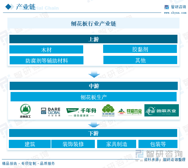 刨花板行业财产链上逛次要为木材、胶黏剂以及防腐剂等辅帮材料。原材料的质量间接影响到刨花板的物能和化学机能。例如,木材的树种、含水率、杂质含量等城市影响刨花板的强度、不变性和耐候性。高质量的原材料可以或许出产出机能更不变、更耐用的刨花板。原材料的价钱波动间接影响到刨花板的出产成本。刨花板的出产成本也会响应添加,从而影响企业的盈利能力和市场所作力。财产链中逛次要为刨花板的出产制制。财产链下逛次要使用于建建、粉饰拆修、家具制制以及包拆等范畴。下逛财产如家具制制、建建粉饰、包拆材料等对刨花板的需求量间接影响刨花板行业的出产规模和成长趋向。当这些行业需求兴旺时,刨花板的销量和价钱往往会上升,反之亦然。因而,财产链下逛的市场需求是刨花板行业成长的主要驱动力。