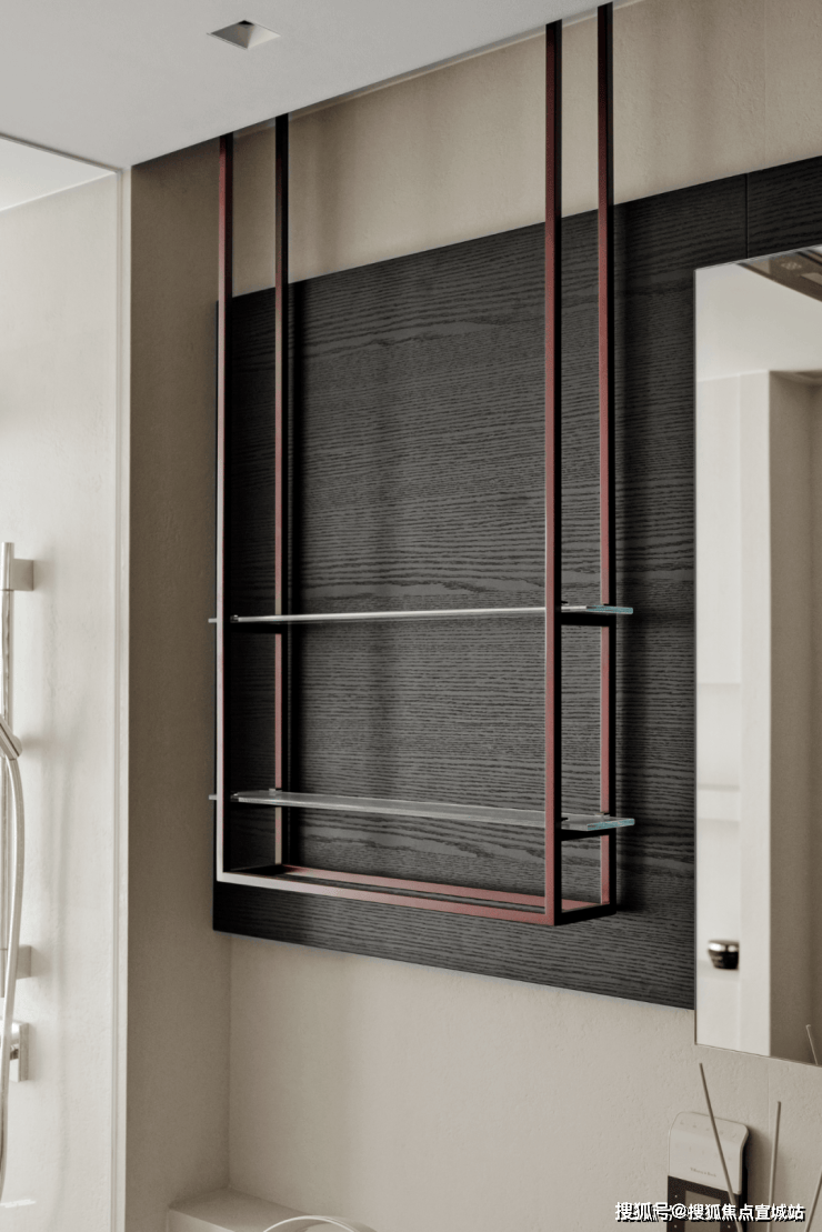 衣帽间成为这首乐章中躲藏的变奏,浅紫色的柜门框取柜正在胁制的色调中腾跃,为稳沉的构制注入一丝不经意的趣味。