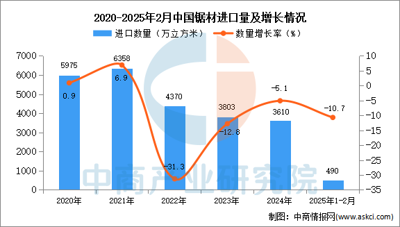 从金额方面来看,数据显示,2025年1-2月中国原木进口金额845。9百万美元,同比下降8。7%。 中商谍报网讯:据中商财产研究院数据库显示,2024年中国原木进口量3610万立方米,最新数据