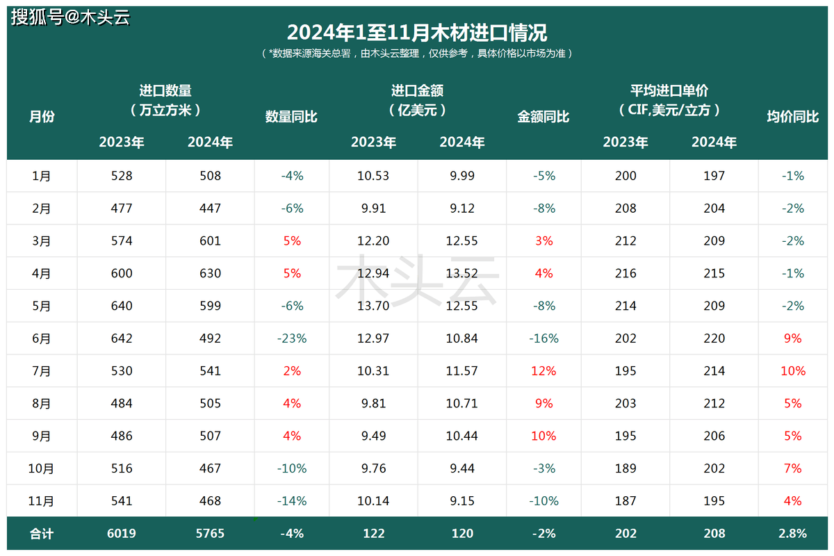 按照海关最新数据,全国木材累计到岸468万立方米,对比2023年同期下降14%;环比10月增加0。4%。进口金额同比下降10%,达到9。1亿美元;环比10月下降3%。11月木材平均进口单价增加4%。