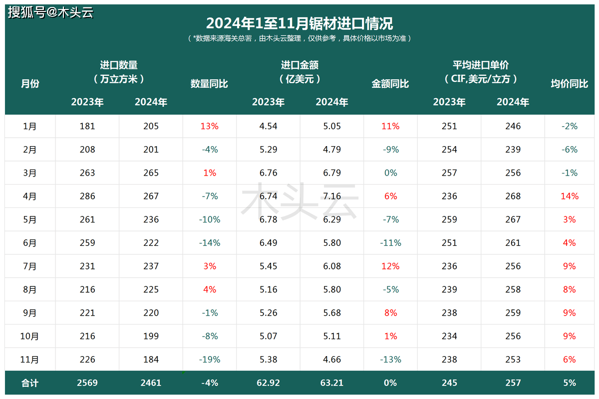 从细分市场来看,2024年11月,全国累计进口原木284万立方米,同比下降10%,进口金额同比下降6%,达到4。49亿美元。11月原木平均进口单价增加5%。取此同时,锯材进口也同步呈现量贬价涨趋向。2024年11月全国累计进口锯材184万立方米,同比大幅下降19%;进口金额同比下井13%,达到4。66亿美元。11月锯材平均进口单价增加5%。