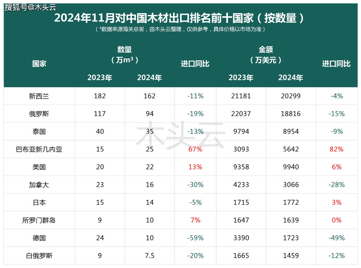 畴前十大供应源来看,巴新、美国以及所罗门群岛正在11月对我国木材出口中呈现正向增加趋向,其余国度如下降11%至162万立方米;俄罗斯下降接近两成,此中,对比2023年同期下降20%,成为本年首个出口下降的月份。而泰国则是由于南部橡胶木种植园洪水,以致采伐以及运输功课遭到障碍,加工成原料供应欠缺,且成本急剧上涨。因而,11月泰国对中国木材出口全体下降了13%。
